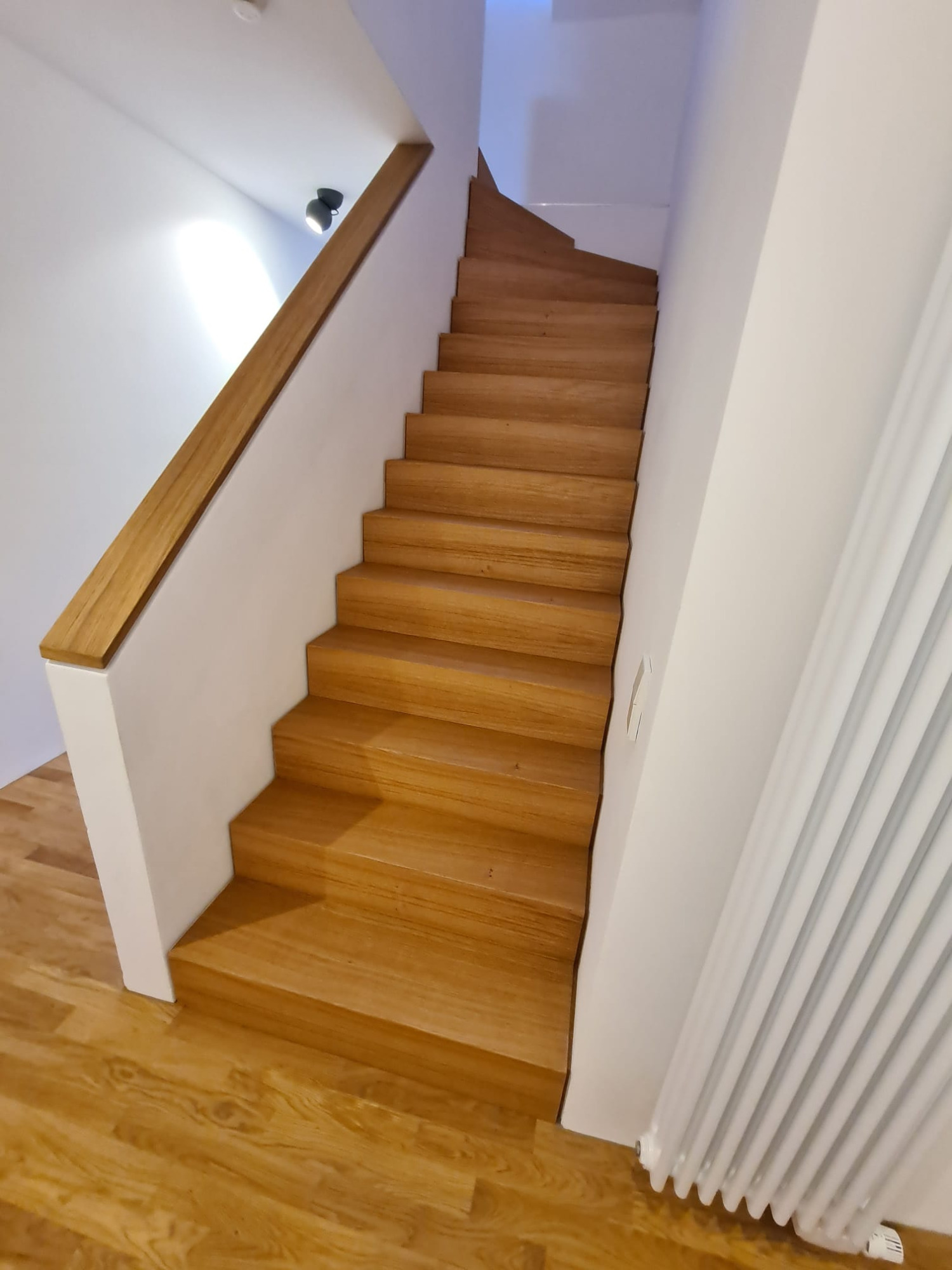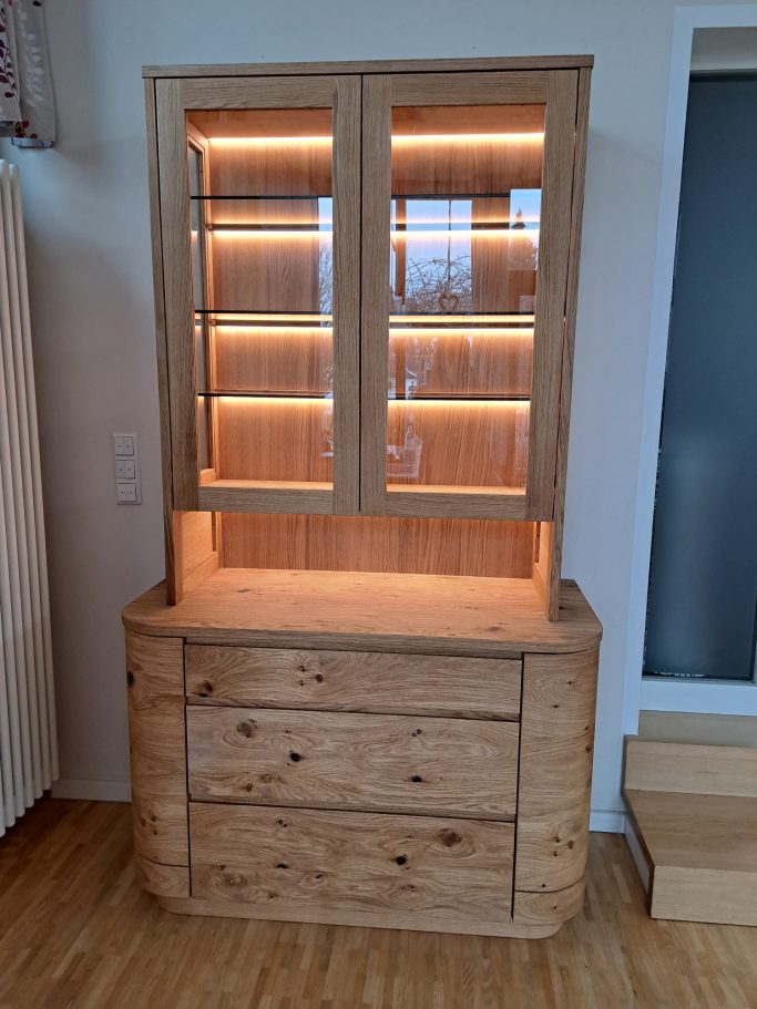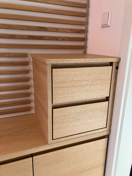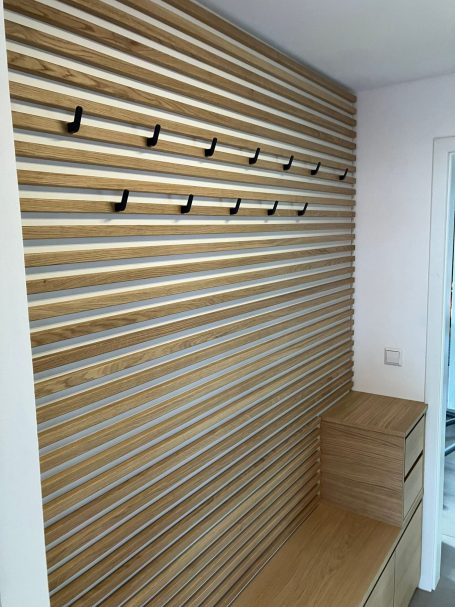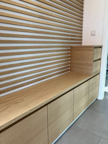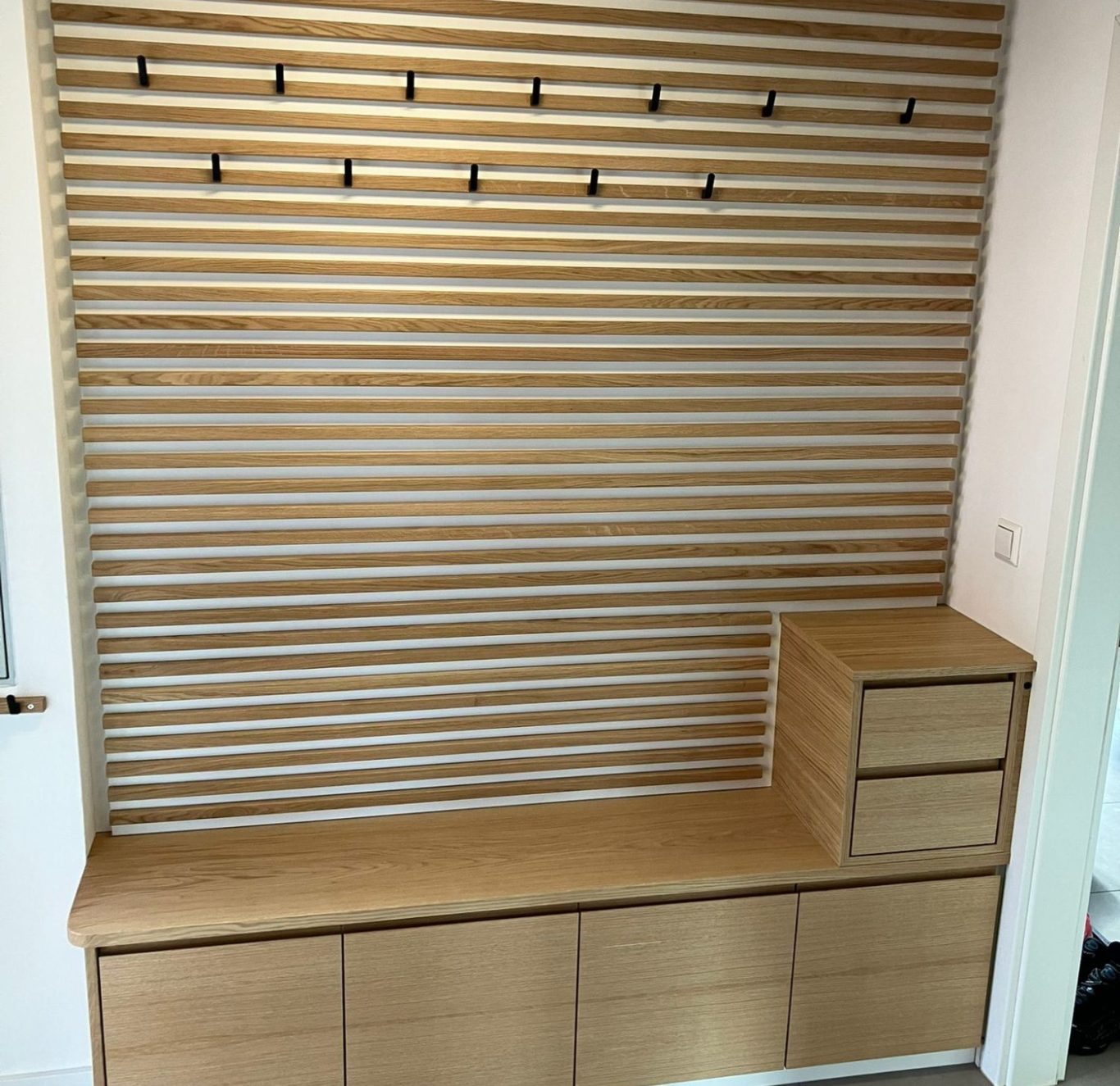 Aktueller Trend - Holzleisten Eiche massiv kombiniert mit weißem Lack Stauraum für Schuhe und Schubkästen für Schlüssel, praktische Sitzbank