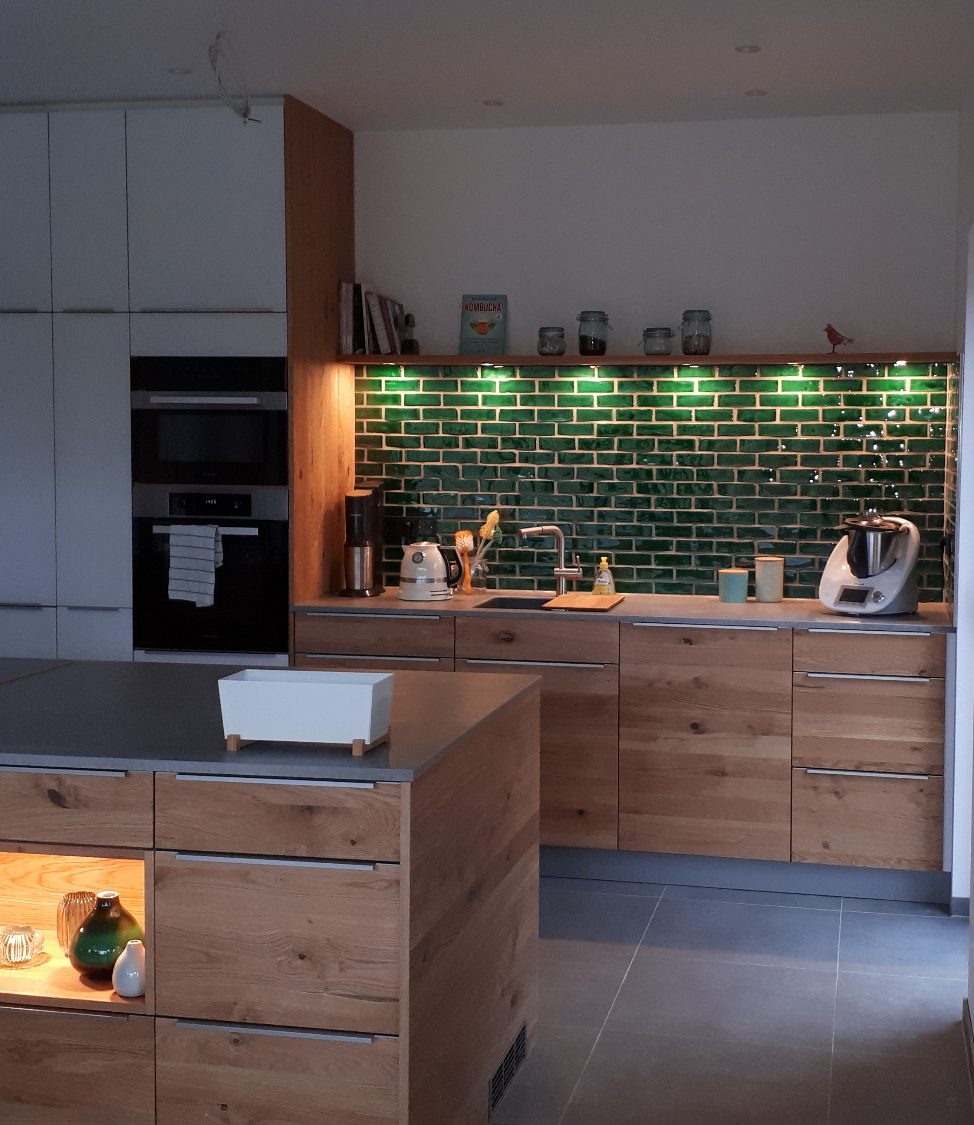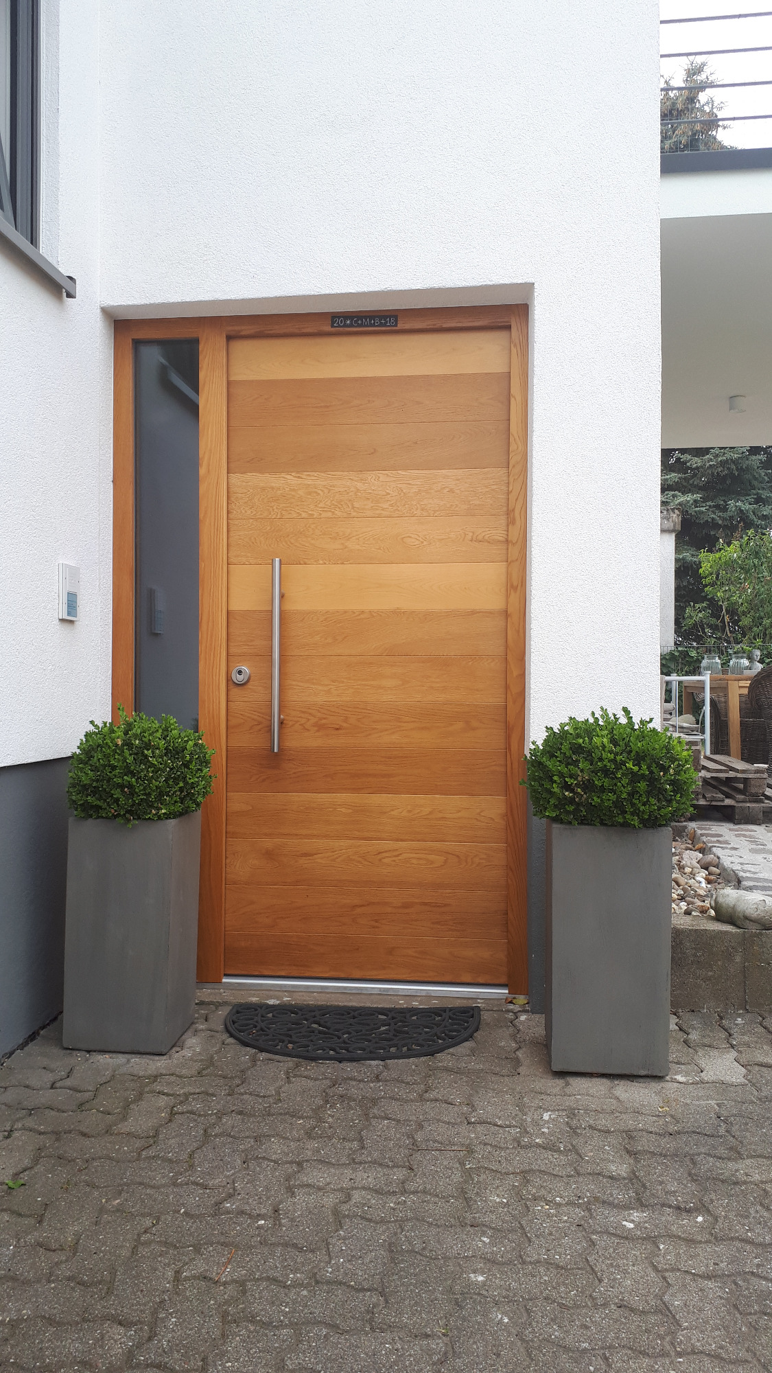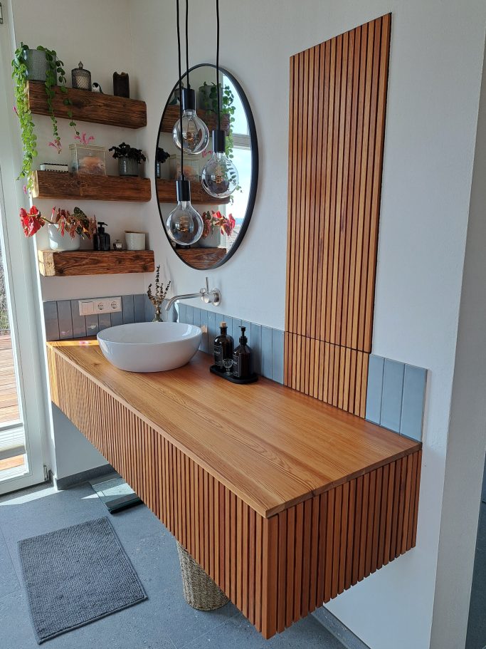 Aktueller Trend - Holzleisten Eiche massiv kombiniert mit weißem Lack Stauraum für Schuhe und Schubkästen für Schlüssel, praktische Sitzbank